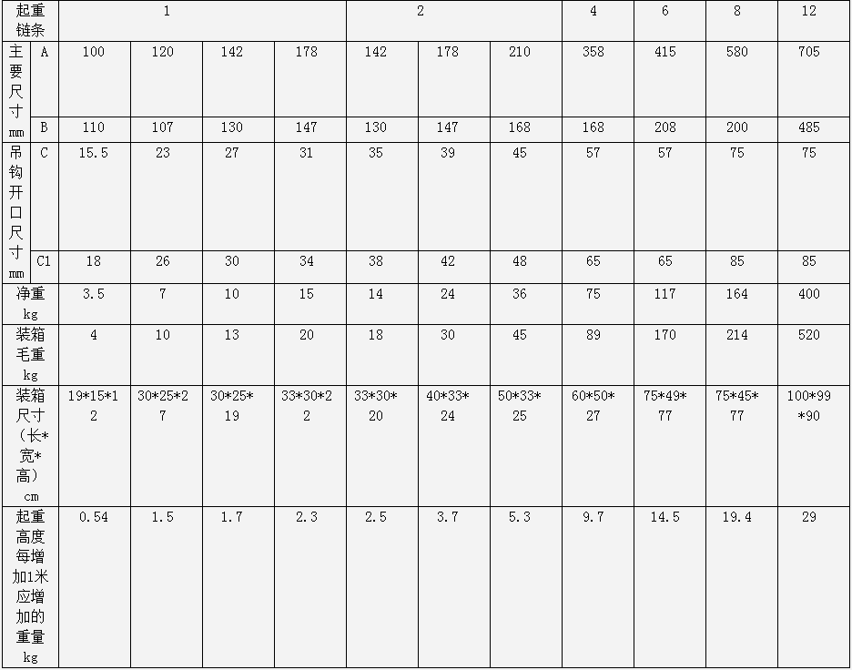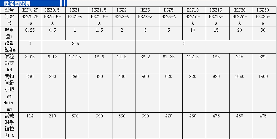 HSZ-A型1噸手拉葫蘆參數(shù):
