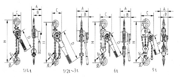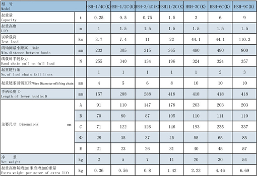 | 武林飛鴿HSH型C(K)類手扳葫蘆參數圖: | |